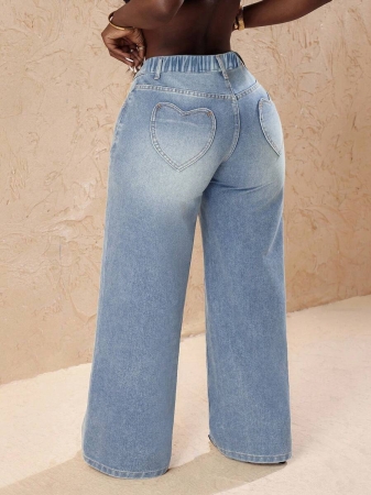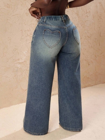 Slaydiva Plus Size Vintage Faded Denim Wide Leg Pants With Heart Pocket, Fashion & Versatile For Summer,Fall Clothes For Women