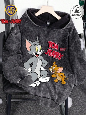 Warner Bros LILL, Autumn And Winter Women’s Tom And Jerry Pattern Hooded Sweatshirt Top, Slightly Stretch Fit Washed And Distressed Cotton Black Pullover Long Sleeve Sweatshirt, Casual Everyday Back To School Season Hoodie Top