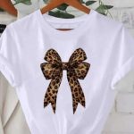 3 reviews for Women Leopard Bow T-Shirt, Casual Crew Neck Short Sleeve Top, 95% Polyester 5% Spandex Knit Fabric, Regular Length, Fashionable For Summer And Spring