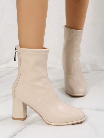 Women Mid-Calf Boots, Beige, Chunky Heel, Back Zipper, Simple And Comfortable