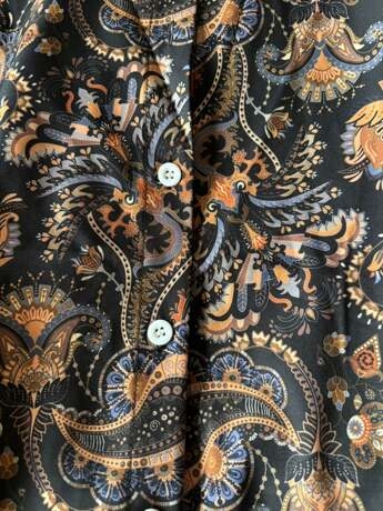 This is a beautiful blouse. I love the paisley design. The colors of different shades of brown, different different shades of gold on a black background just makes this blouse look so rich and expensive. The material is 100% polyester. It is on the lighter side, it is not see-through. This is a great blouse to have in your wardrobe. I am 5 foot five, 137 pounds, 34B and the medium was a great fit.
