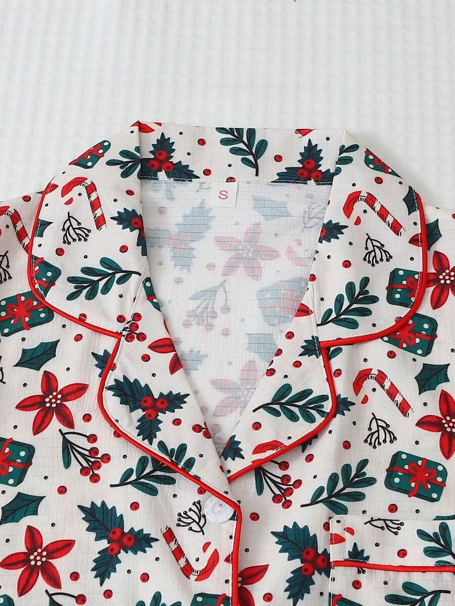 3 reviews for Women’s Christmas Candy Cane Print Lapel Button Short Sleeve Top And Bow Shorts Pajama Set, Suitable For Christmas Home Use, Spring/Summer