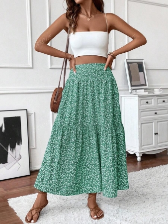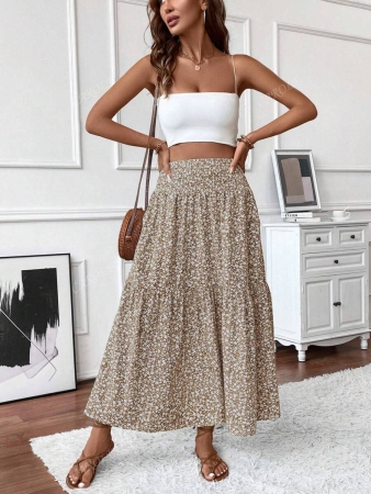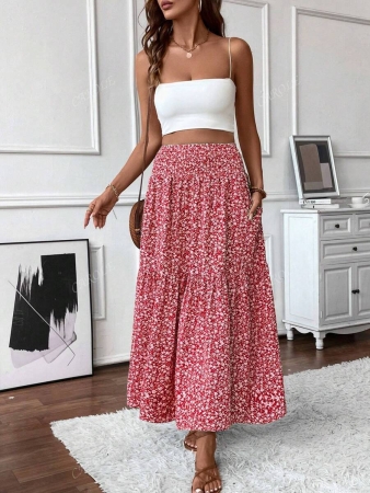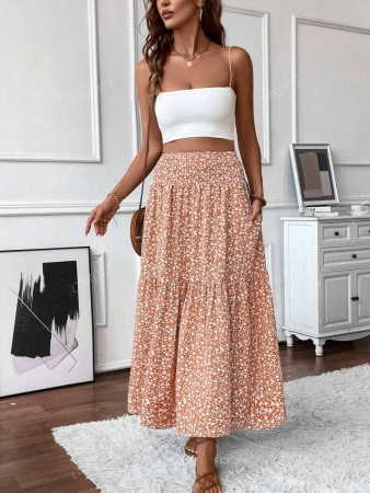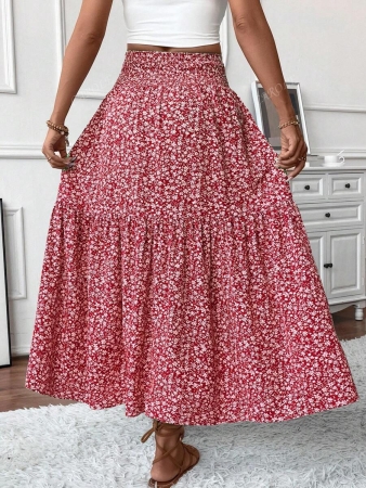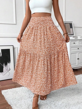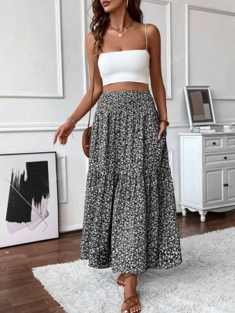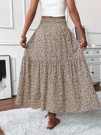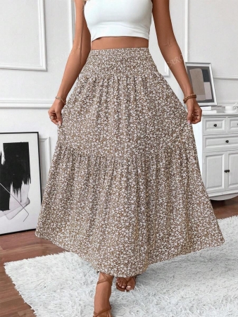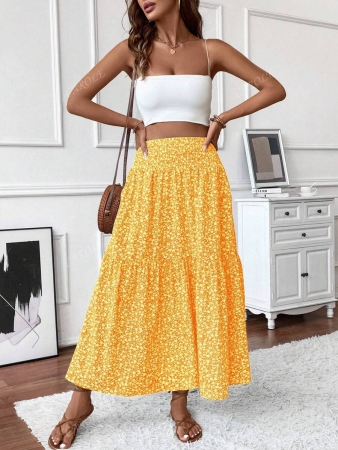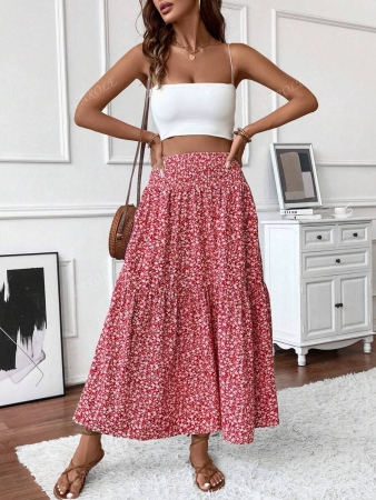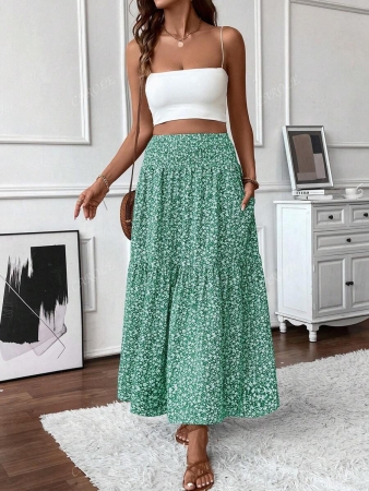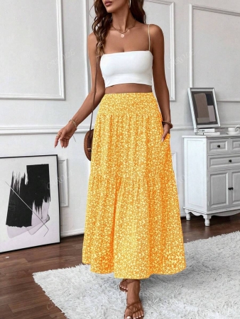Women’s Maxi Skirt Tiny Floral Casual Elastic Waist With Pockets Ruffled Hem Ladies Summer A-Line Long Skirts