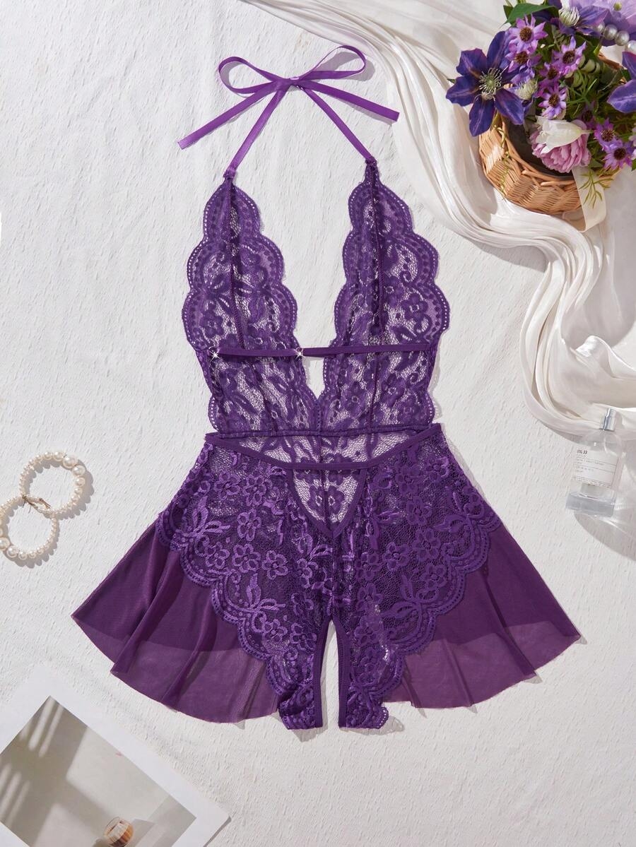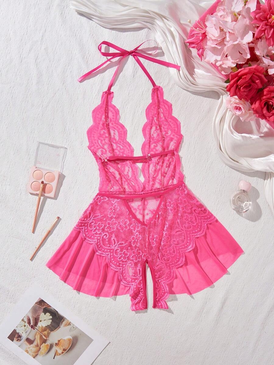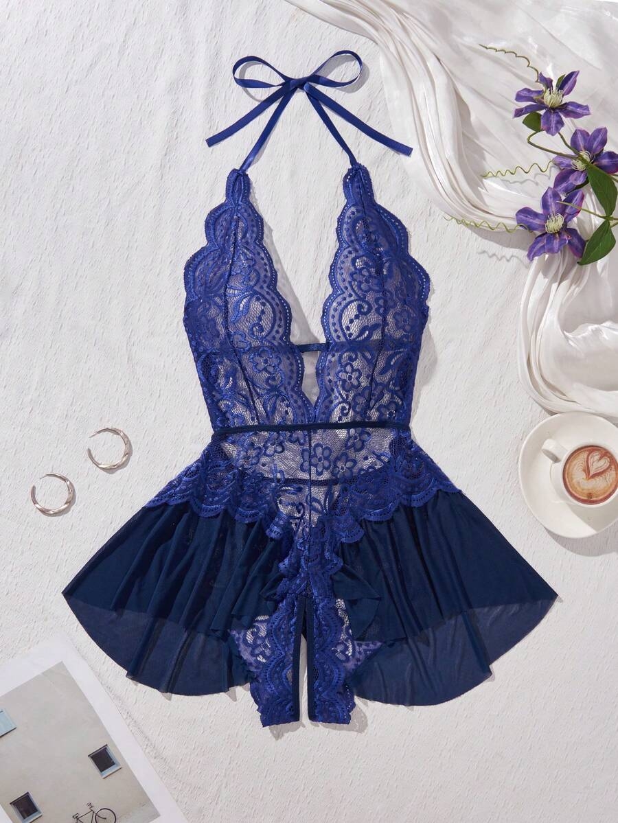 Women’s Open Crotch Lace Decorated Backless Halter Neck Sexy Bodysuit With Ruffle Trim, Rave
