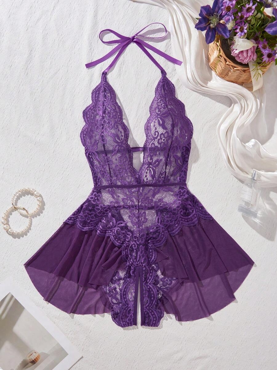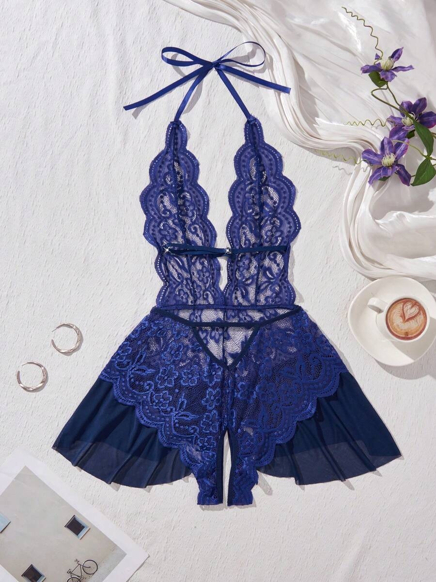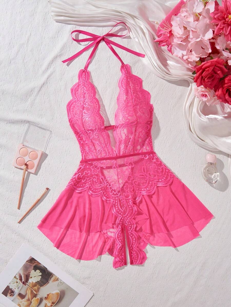 Women’s Open Crotch Lace Decorated Backless Halter Neck Sexy Bodysuit With Ruffle Trim, Rave