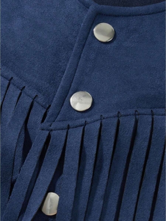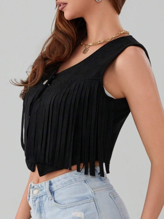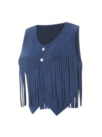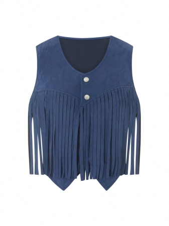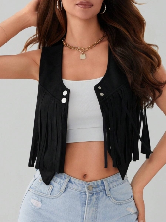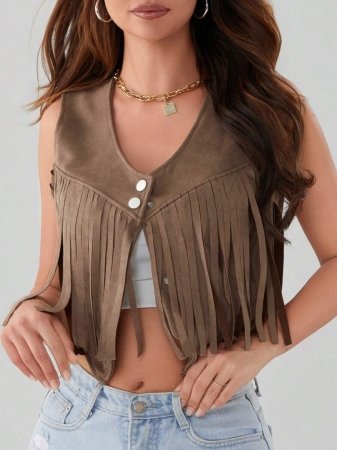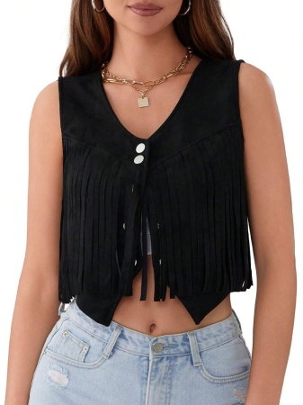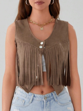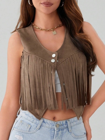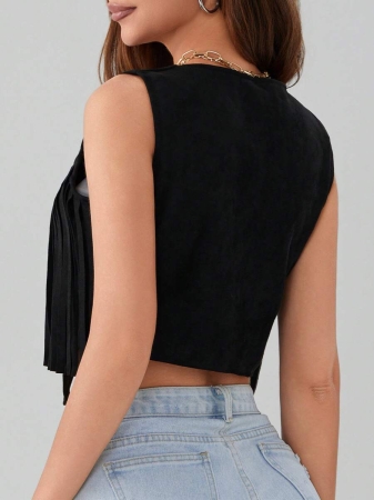 Women’s Tassel Suede Vest Solid Color Front Button Sleeveless Hippie Crop Jacket Retro Waistcoat