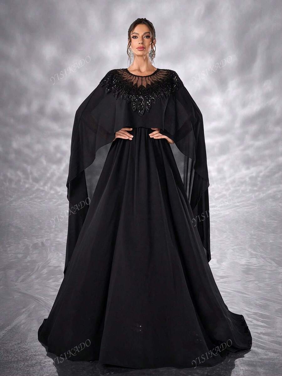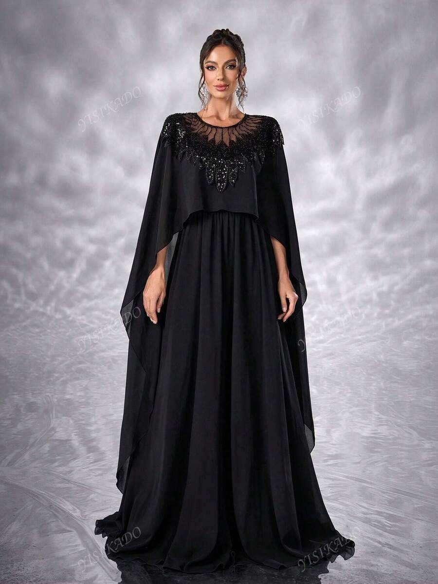 YISIKADO Women Chiffon Prom Dress Mesh Contrast Sequin Bolero Modest Long Dress Round Neck Elegant Festival Banquet Party Graduation Wedding Guest