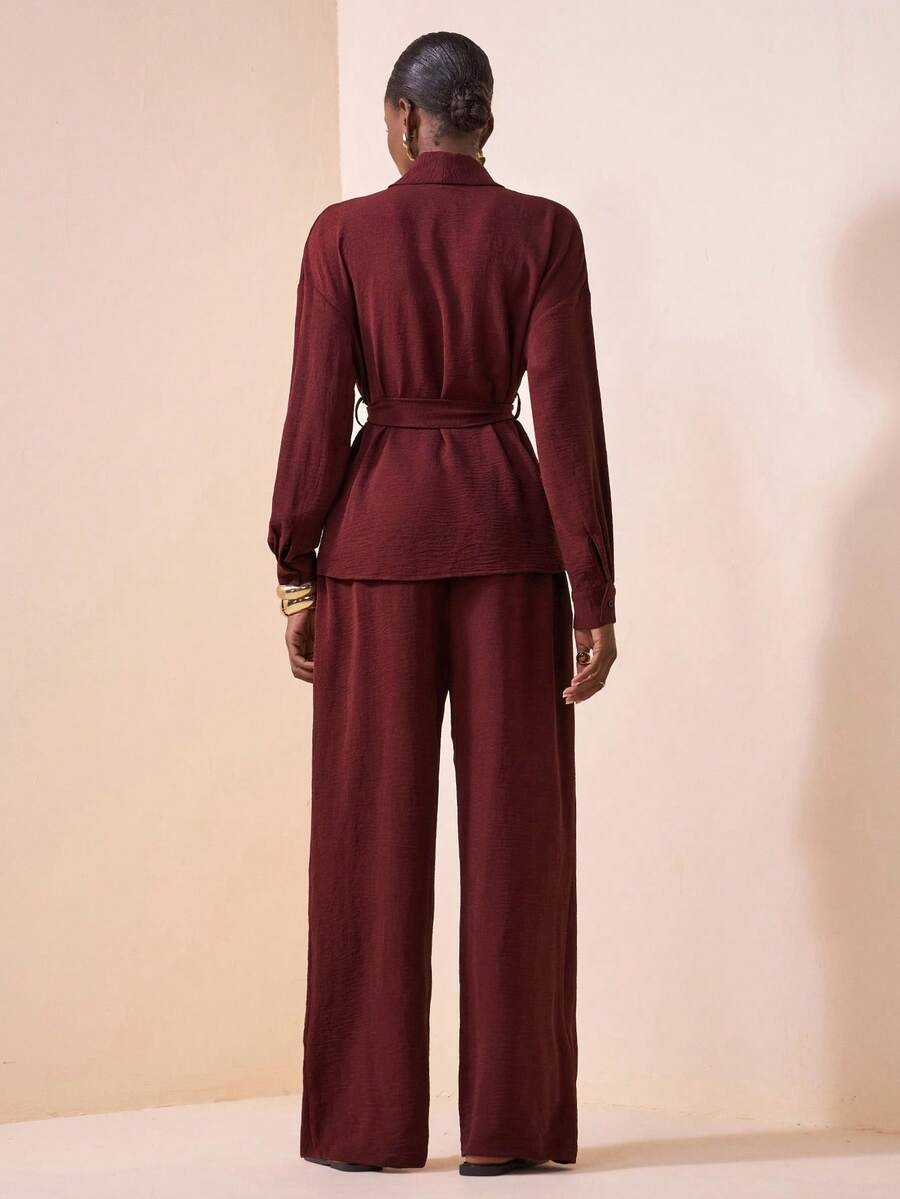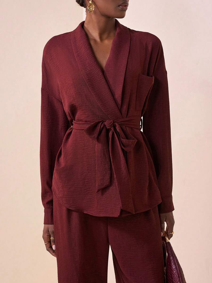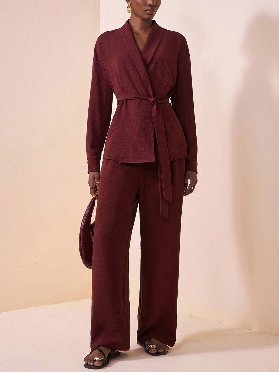 Zivah 2025 Autumn New Music Festival Western Nomadic Style Birthday Party Graduation Student Daily Casual Vacation Cruise Beach Sunbathing Viral Streetwear Halloween Costume Wedding Guest Bohemian Commute Brunch Business Casual Airport Party Holiday Elegant Long Sleeve Waist Tie Top And Wide Leg Pocket Pants 2-Piece Suit, Burgundy